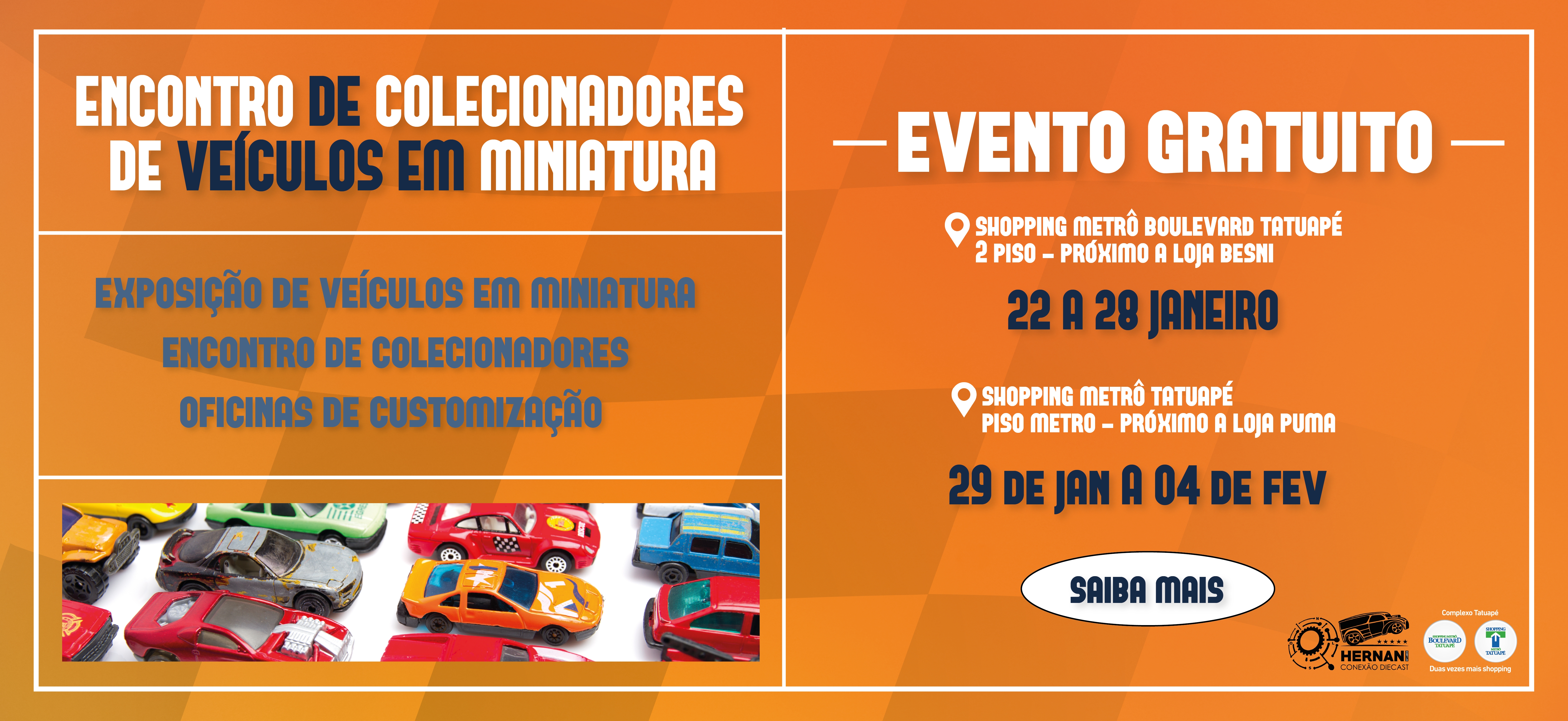 Os amantes de veículos em miniatura podem comemorar, pois o Complexo Tatuapé, formado pelos Shoppings Metrô Tatuapé e Metrô Boulevard Tatuapé, está recebendo mais uma edição do Encontro de Colecionadores até o dia 4 de fevereiro. O evento, gratuito, também contará com uma exposição de miniaturas e oficinas de customização dos veículos.